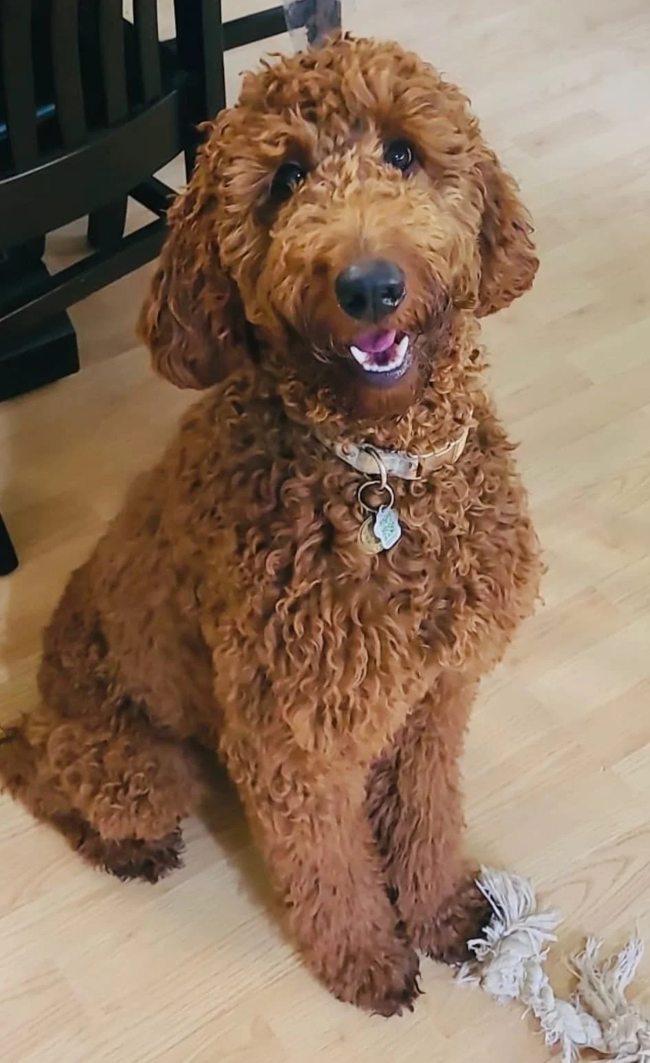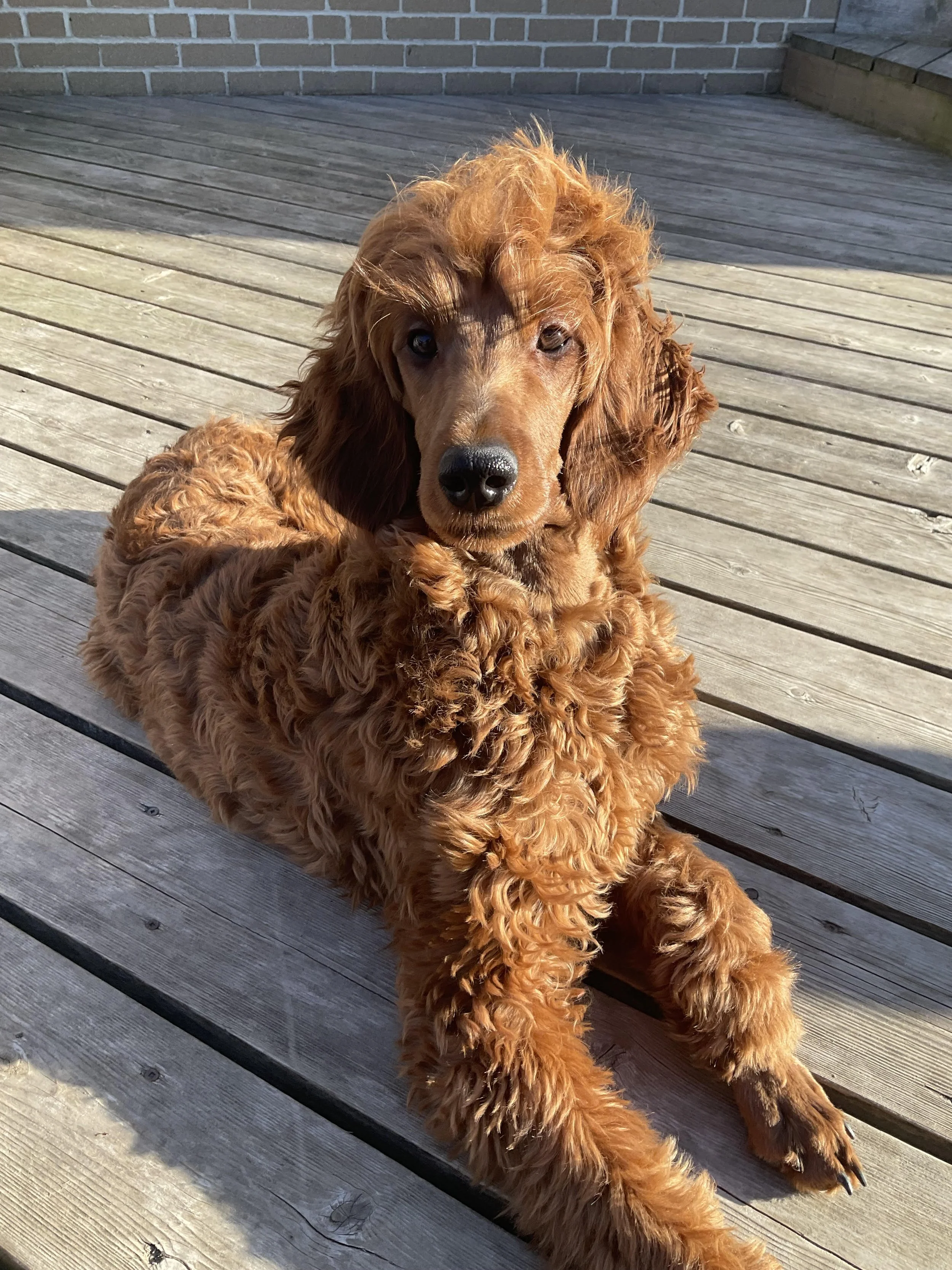 Magnolia comes from Ponsonby’s healthy blood lines and lineage. She is an exquisite example of an F1 Irishdoodle with her mahogany, fleecy, fluffy, teddy bear style coat. Maggie loves to swim and play near the water in the summer and even accompanies her human brothers to the splash pad! She enjoys playing fetch with her furry friends and is a very social lady. She will make friends with any dog, child, or stranger! Maggie is very cuddly and always accepts a snuggle from her guardian family.