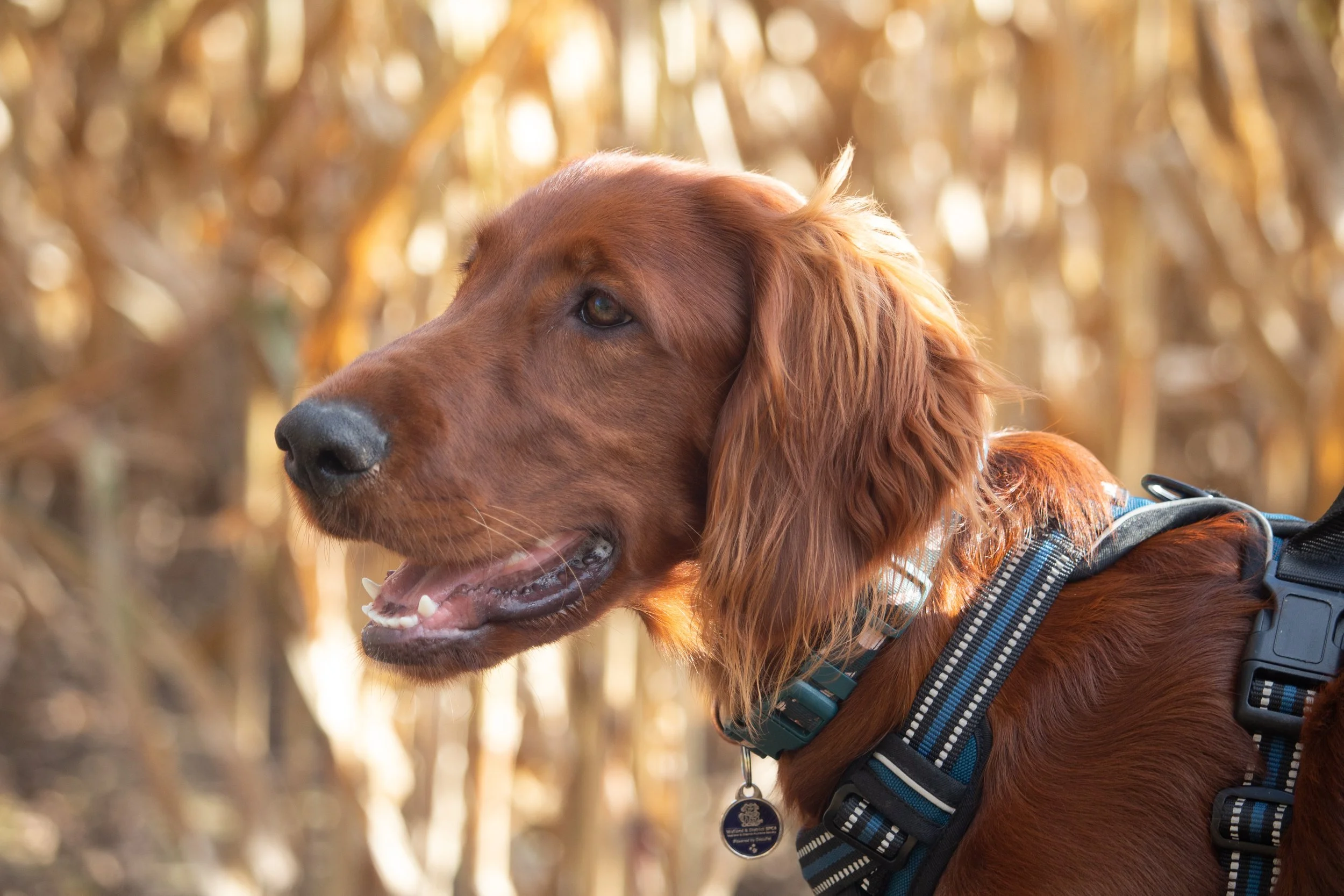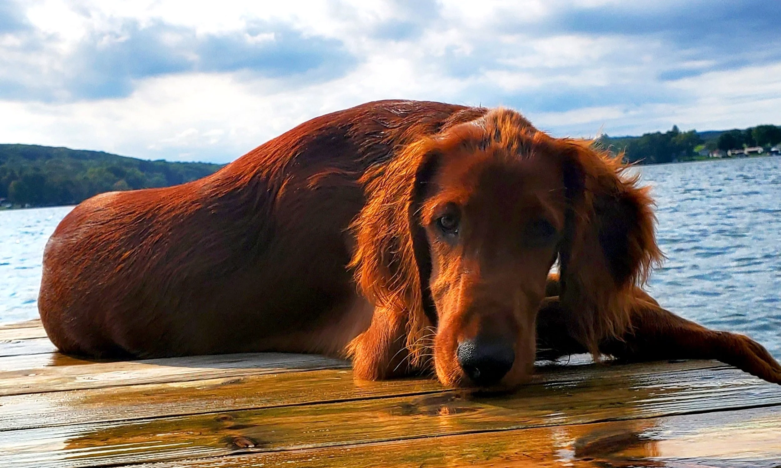 Full sister to Keeley, River is an exquisite and gentle natured Irish Setter. She is a sweet soul who dearly loves her human family. Her most favourite things to do are chase a ball, and go for long walks along the river where she lives.