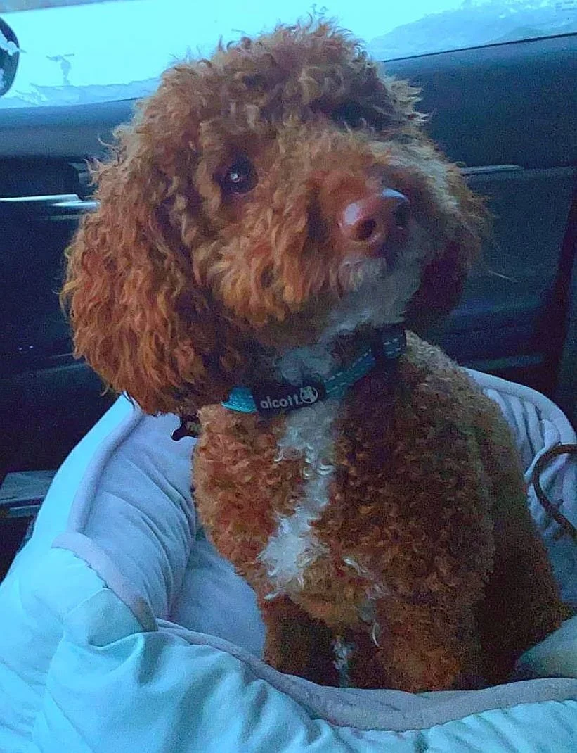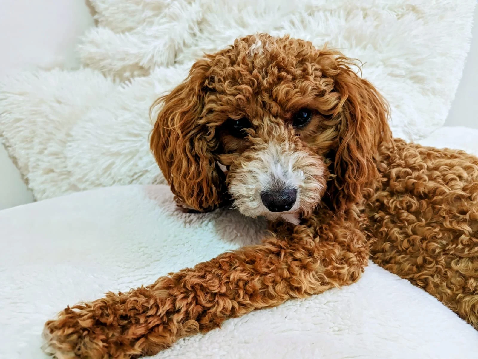 Posnonby’s Tigger is a CKC Registered Miniature/Moyen Poodle weighing in at 16lbs. His non-shedding, rich red curls are contrasted by his white points, which classify his markings as a red-on-white Tuxedo. Tigger is a good natured and loyal soul who gazes into his human’s eyes while he waits for a cuddle. He is also great with other dogs, he loves to play, and curls up at the end of the day with his Aussie-doodle big brother Cole. Tigger’s puppies will weigh in between 28-42lbs, depending on who he is bred to.