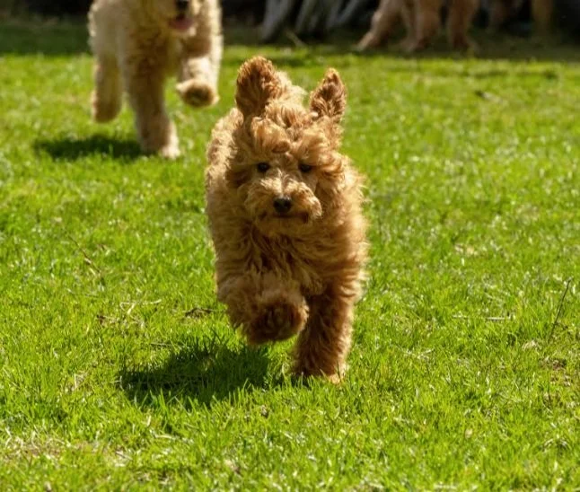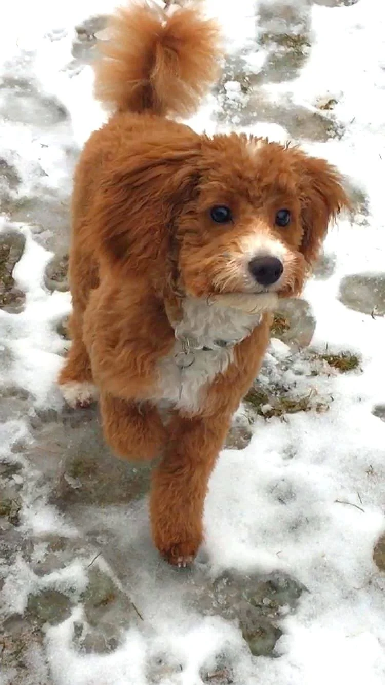 Born in June of 2020, our wonderful Rooney has grown into a kind and brave soul. He has reached his adult weight of 60 lbs and is is a medium sized Standard Poodle. Calm and lovable, Rooney’s intelligence and gentle nature has shone through since the first day he arrived with us. He lives with his Guardian family near Ponsonby Ontario and is a great companion to the children in his family. Rooney’s deep red fur is rich and rare in colour, which lends its completely non-shedding quality to the Irish Doodles & Goldendoodles he sires.